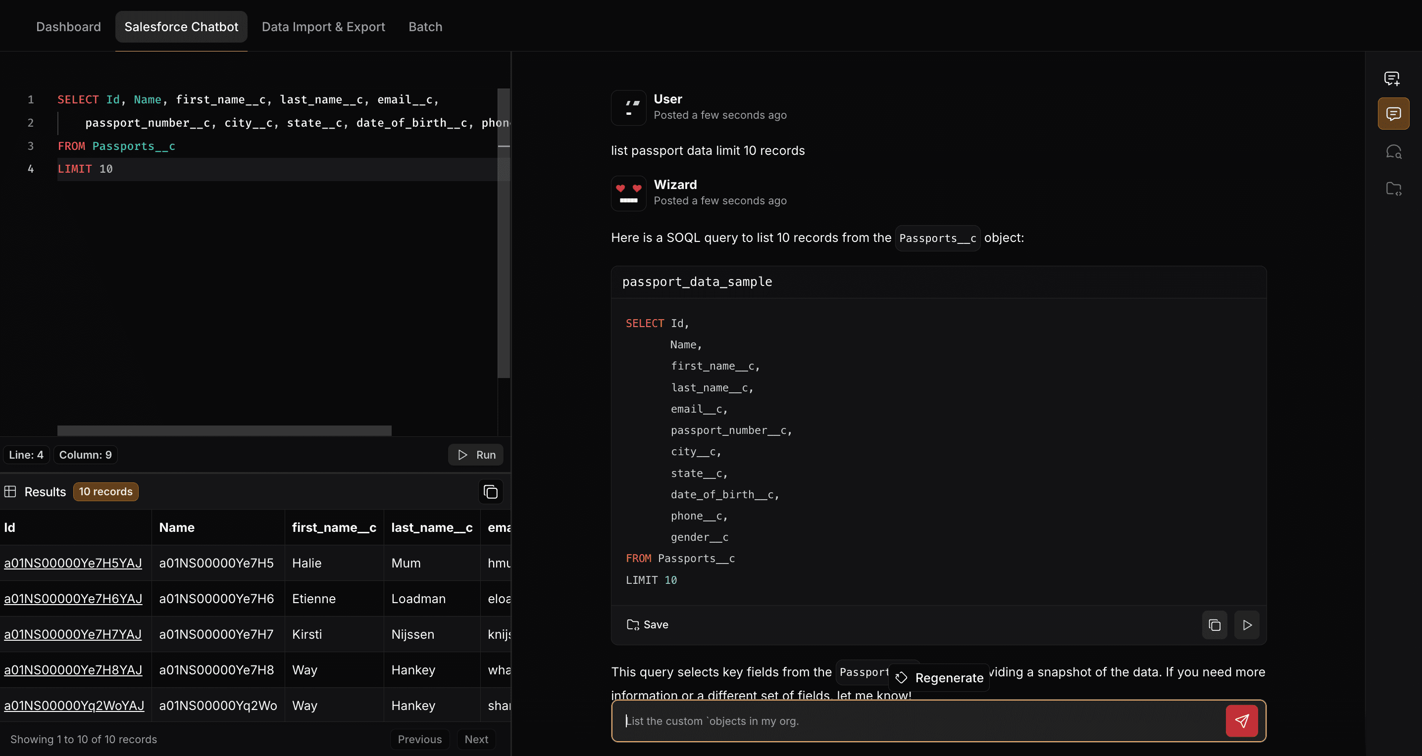 DonkeyApp’s Salesforce Chatbot allows users to instantly generate data insights without the need to write complex queries. Just ask in natural language and get detailed reports or SOQL queries ready for use. Save frequently used queries as snippets, maintain chat history for easy reference, and export reports in CSV or JSON formats. All actions are performed using metadata, ensuring your data remains secure and never accessed by AI models.
