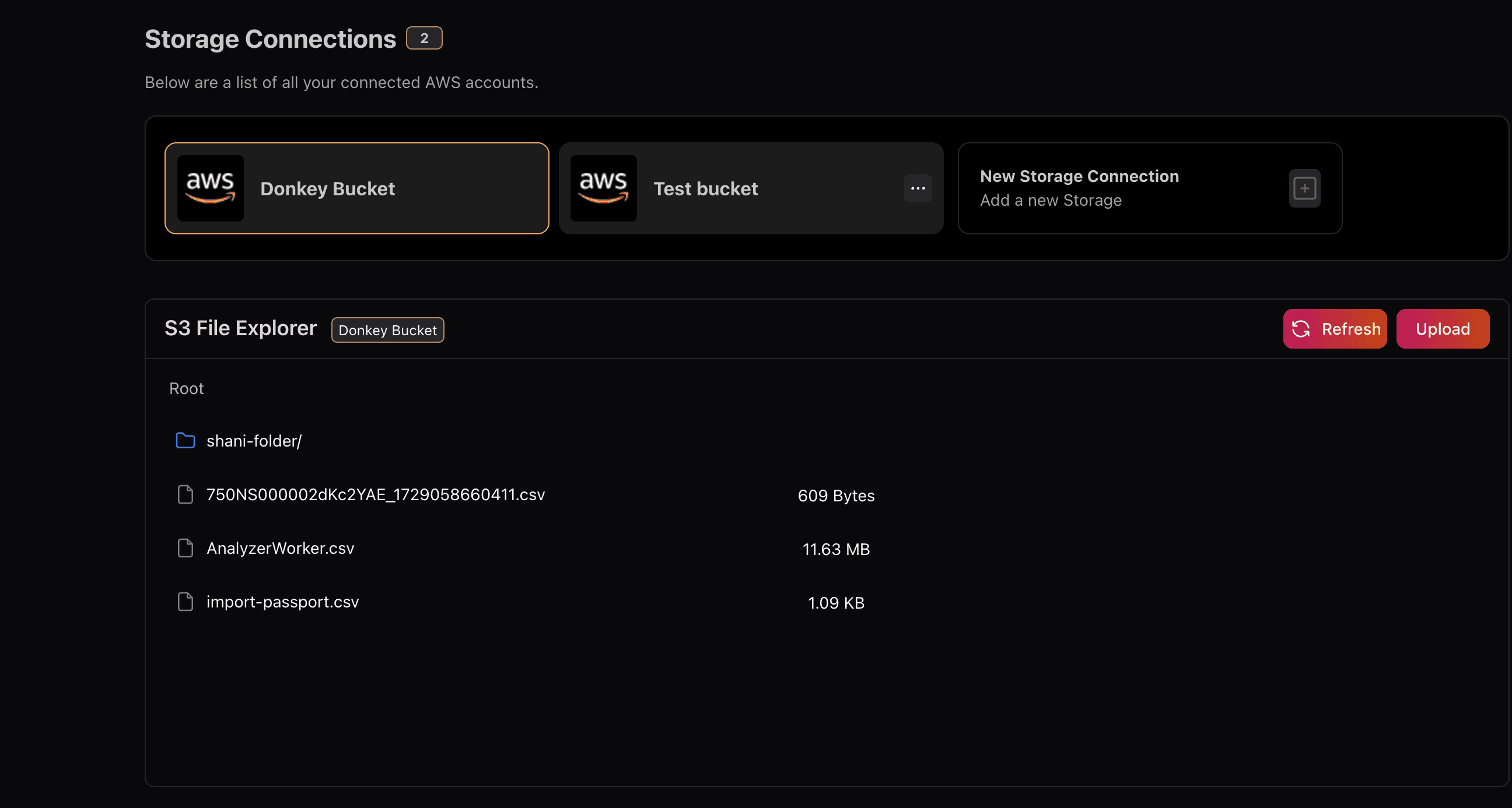 DonkeyApp’s Storage feature provides users with streamlined access to their files, offering both DonkeyApp-managed storage and user-managed storage options. This ensures centralized file access across the DonkeyApp platform, enabling quick actions and seamless data handling. Whether you're working with large datasets or frequently used files, the storage solution allows for smooth integration across features like Data Import, Export, and Batch Processing.